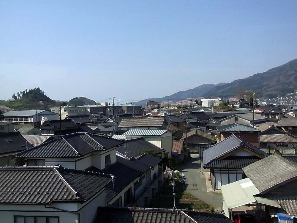 Ninohe city seen from the main road. There became a town in the basin surrounded by mountains.